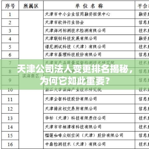 隨著市場經(jīng)濟(jì)的發(fā)展,企業(yè)法人變更成為常態(tài),天津作為一個經(jīng)濟(jì)繁榮的城市,其企業(yè)法人變更的需求也日益增長,本文將圍繞“天津法人變更公司排名”這一主題展開,探討天津地區(qū)法人變更公司的排名及其背后的原因,并強調(diào)法人變更在公司運營中的重要性。